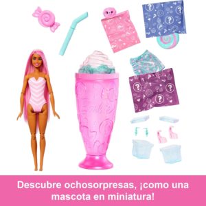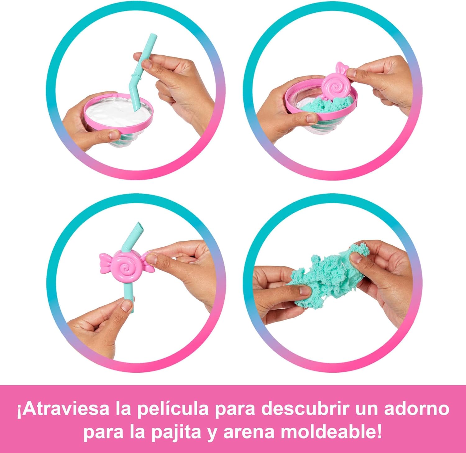 Las muñecas de la Colección Dulces de Barbie Pop Reveal ofrecen toda una experienciasensorial con las ochos sorpresas dentro de un vaso con una temática de lo más azucarada. Dsenrosas la tapa con forma de nata montada para descubrir arena moldeable y atraviesa la película con la pajita. ¡Verás qué blandito! Retira el envoltorio del vaso y descubrirás una muñeca Barbie con un dulce aroma, además de otras seis sorpresas. Qué muñeca te tocará? Puede ser Donut Creams, Cool Cupcake o Sweet Swirl. Sigue abriendo y descubre dos cubitos de hielo reutilizables que se abren. Contienen unos pendientestemáticos y un par de zapatos o botas. En las bolsas misteriosas encontrarás una falda colorida, una mascota blandita perfumada y una cama para mascotas a juego. Sigue descubriendo sorpresas con la transformación de cambio de color que ocurre en la cara de la muñeca Barbie. ¡Querrán coleccionarlas todas! Las muñecas se venden por separado y están sujetas a disponibilidad. Las muñecas no pueden tenerse en pie por sí solas. Los colores y la deocración pueden variar.