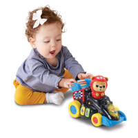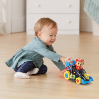 Bruno Brum sale disparado a la pista con solo presionar su cabeza o empujarlo hacia atrás, invitando al peque a gatear o dar pasitos tras él mientras las luces parpadean y suenan frases de carrera. Los tres botones de colores enseñan números, palabras y reproducen 3 canciones y 15 melodías, enriqueciendo vocabulario y sentido del ritmo. La banderola giratoria marca la salida y la meta, reforzando la coordinación mano-ojo y la noción causa-efecto. Perseguir el coche ejercita la motricidad global y despierta la imaginación de grandes premios. Diseño resistente, control de volumen y desconexión automática aseguran diversión segura y duradera.