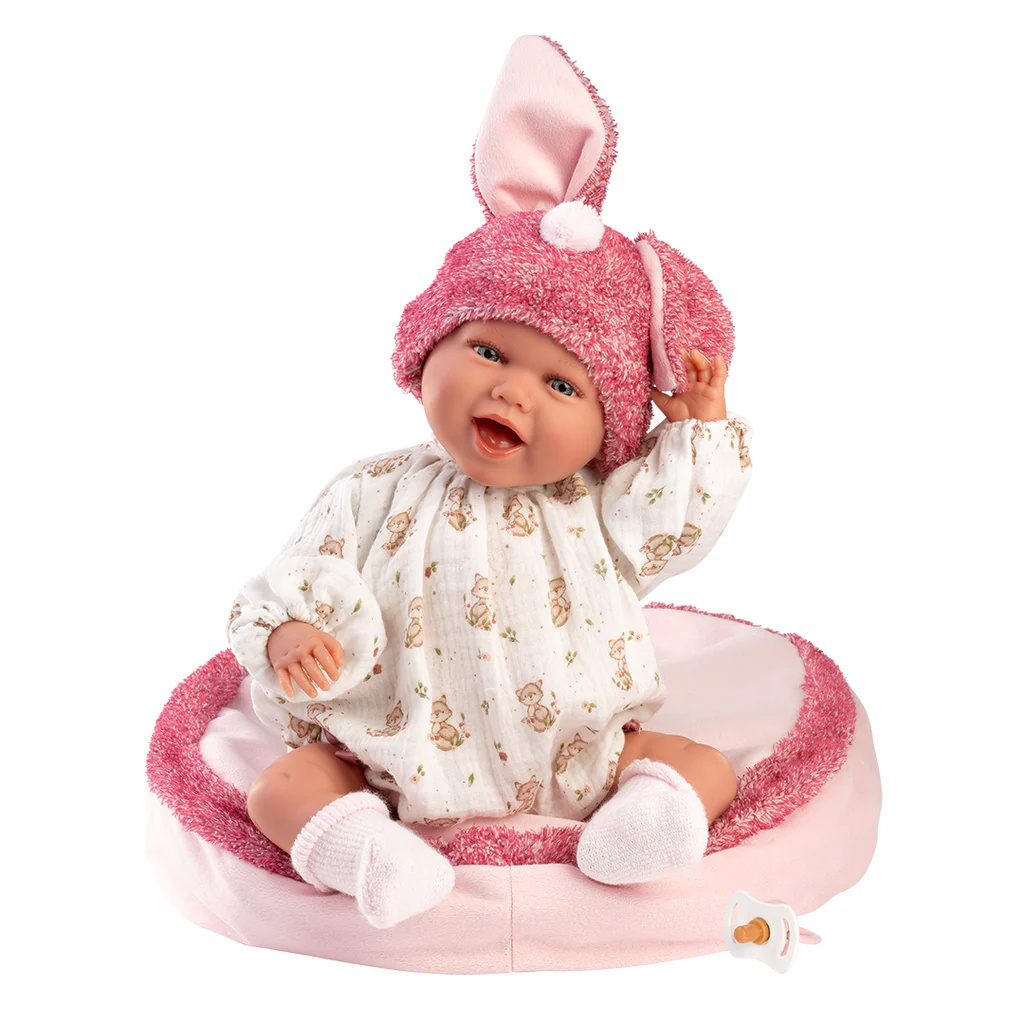 Muñeca Mimi Sonrisas con cojin 42 cm. Cuerpo de tela y mecanismo de sonido