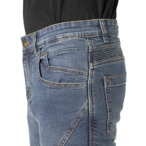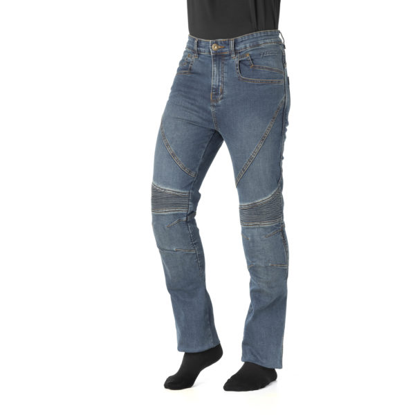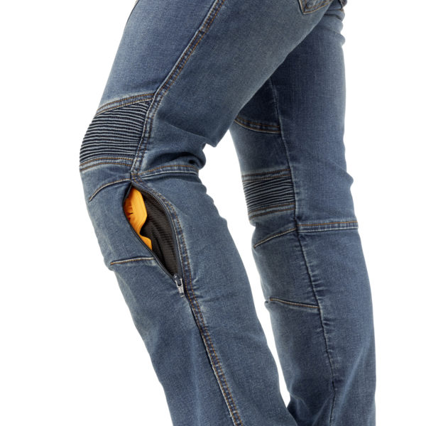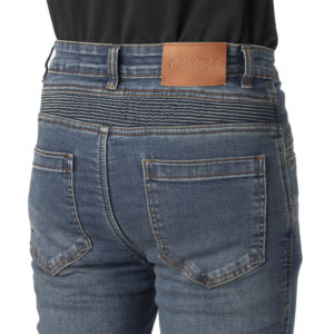 Pantalón vaquero elástico de hombre, ¿vas buscando un vaquero para ir en moto, cómodo, flexible, ligero y que te proteja?, acabas de encontrarlo!!, este pantalón cumple con todas tus expectativas y con algunas más; no sería necesario hablarte de él si te lo probaras, porque entonces te lo llevarías puesto, pero como no es el caso, te vamos a dar algunos datos sobre este modelo que te gustarán. El modelo Durango Advance, sustituye al modelo Durango del año pasado; en esta prenda hemos mantenido el diseño porque tiene mucho éxito, pero hemos mejorado muchos pequeños detalles con vuestra ayuda. Ahora, el tejido es más flexible, con lo cual el pantalón es mucho más cómodo, hemos subido el talle, ahora es más alto, hemos cambiado las protecciones, usando unas nuevas que no pesan nada y tampoco abultan, además de tener la posibilidad de moverlas según tú necesidad mediante las diferentes posiciones que te ofrece el bolsillo interior del protector, también, hemos añadido una tira reflectante en el interior del camal, por si son un poco largos para ti y no te apetece cortarlos, solo tendrás que darle un par de vueltas hacia arriba y problema resuelto. Nos gustaría hablarte sobre las protecciones, ambas están alojadas dentro de bolsillos recubiertos de Kevlar, puedes acceder al protector de rodilla mediante cremallera lateral exterior, el de cadera sin embargo, accedes a él por el interior del pantalón; Es importante recordarte, que los fuelles elásticos que están encima de las rodillas y en la zona lumbar juegan un papel importante cuando te sientas, agachas o ejerces algún movimiento de flexión. Y para finalizar, informarte que el nivel conseguido en esta prenda es AA.