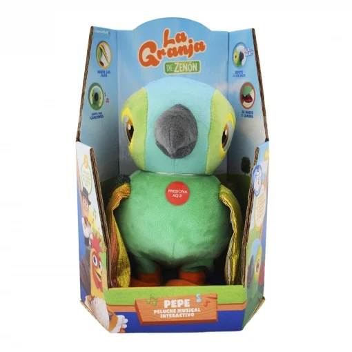 Divertido y simpático pelucha del lorito Pepe, canta, anda y repite tu voz. Aprieta su ala y escucha tus canciones favoritas de la granja ahora con nuevos materiales más brillantes y suaves.